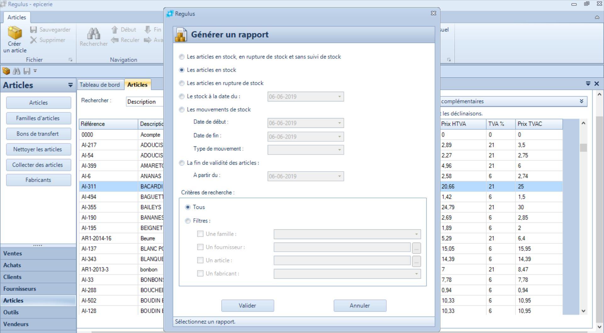 - Possibilité de générer des rapports de stock détaillés sur les articles restant en stock, les articles en rupture de stock, les mouvements de stock (entrées, sorties, périmés, ...) avec ou sans filtre